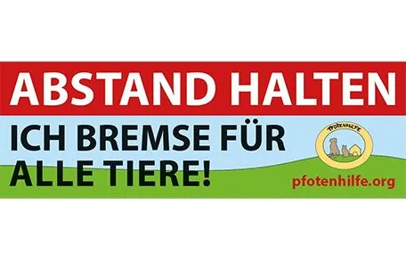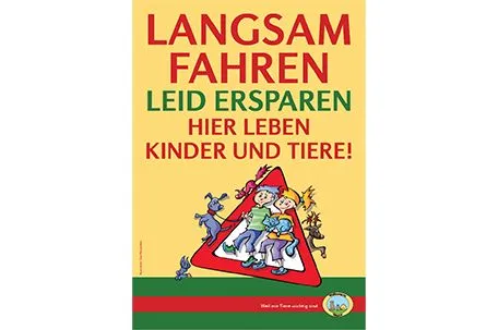 „Langsam fahren, Leid ersparen - Hier leben Kinder und Tiere!“ steht auf Kunststoffschildern in DIN A1 bzw. A2, die etwa für den Gartenzaun hier gegen freie Spende bestellt werden können. Einen Autosticker mit der Aufschrift „Abstand halten! Ich bremse für alle Tiere“ gibt es auch mit Magnetfolie, die jederzeit unbeschädigt wieder abnehmbar ist.