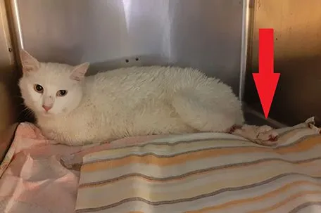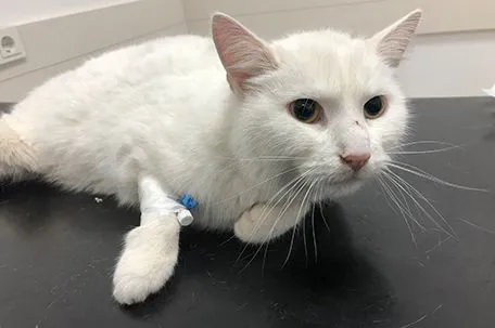 Auf der B147 Richtung Braunau wurde kurz vor dem Bahnübergang in Ach (Gemeinde Munderfing) am Samstag um 21.30h ein schwer verletzter, weißer Kater gefunden. Ein Bein hing völlig verdreht weg, was auf einen Autounfall mit Fahrerflucht schließen lässt. Der arme Kerl ist im Schockzustand mitten auf der Bundesstraße sitzen geblieben. Nur durch die rasche Reaktion der Insassen des nächsten Fahrzeugs konnte noch Schlimmeres verhindert werden. Diese sicherten sofort den Unfallort ab und wählten - weil der weiße Kater durch die Schmerzen aggressiv reagierte - den Notruf der Pfotenhilfe.