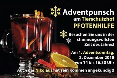 Adventpunsch am Tierschutzhof Pfotenhilfe am 2. Dezember 2018 (1. Adventsonntag) von 14 - 16.30 Uhr. Eine Anfahrtsbeschreibung und alle weiteren Infos findet man hier.