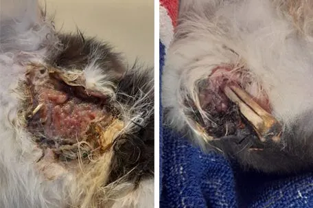 und zum Tierschutzhof PFOTENHILFE in der Grenzregion OÖ/Sbg. gebracht. Dort wurde sie sofort erstversorgt und dann direkt in die Tierklinik gebracht. Bei der Katze war ein Auge vom unbehandelten Katzenschnupfen bereits derart zerstört, dass es nur noch operativ entfernt werden konnte, ein unversorgter, nicht frischer Beinbruch, bei dem der Knochen herausstand - offenbar abgemäht - endete in einer Beinamputation, und eine riesige Wunde am Bauch musste genäht werden. Laut Finderin stamme die Katze aus einer nahegelegenen Landwirtschaft, wo unzählige weitere unkastrierte, kranke Katzen dahinvegetieren, weshalb die PFOTENHILFE den Fall sofort den Behörden gemeldet hat.