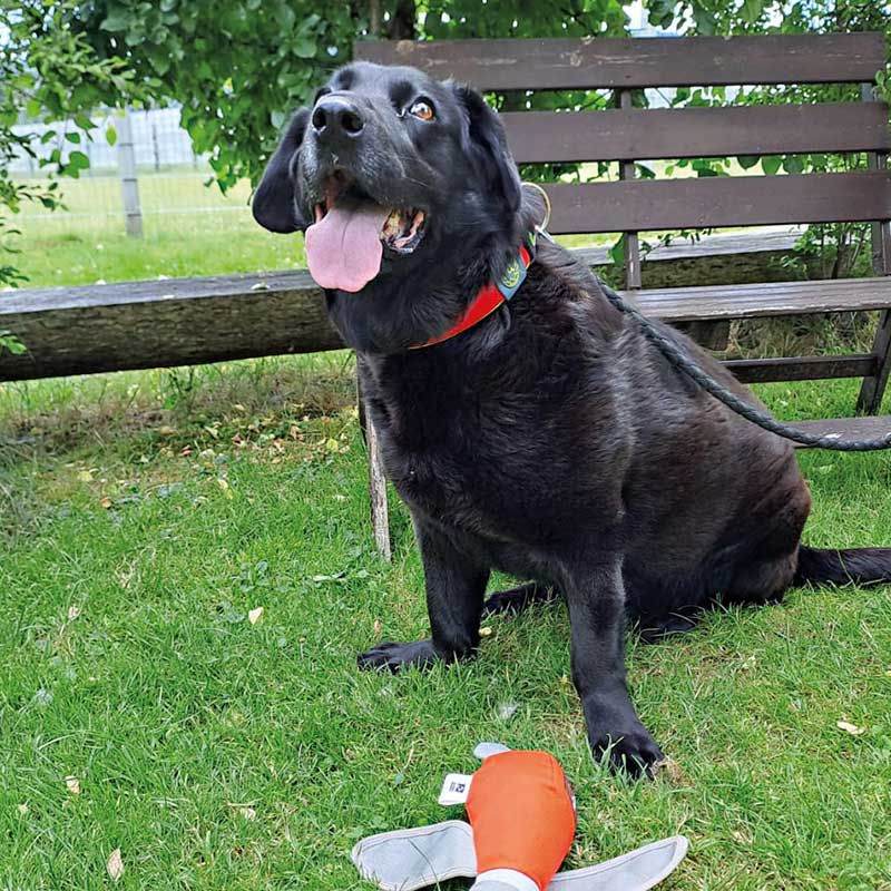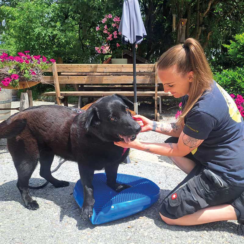 Der zu Hilfe gerufene Amtstierarzt wollte, dass alle Tiere möglichst schnell dort wegkommen. Und so haben wir sieben Hunde aufgenommen. Eine der Hündinnen ist Blacky. Sie wurde sogar noch vor dem Amtstierarzt zu verstecken versucht. Blacky ist eine erst fünfjährige herzensgute Hündin. Aber sie hat große Probleme in beiden Vorderbeinen. Die Arme ist durch eine Überdehnung der Bänder in den Karpalgelenken hochgradig durchtrittig. Der Tierarzt sagt, dass es einen konkreten Auslöser für diese Hyperextensionsverletzung gegeben haben muss, etwa einen Sprung aus großer Höhe – möglicherweise auch unfreiwillig. Sie könnte etwa aus einem Fenster geworfen worden sein.