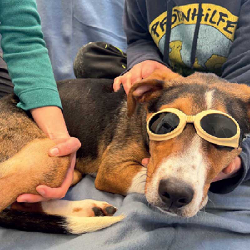 Nachdem wir Miki unserem Hoftierarzt vorstellten, war schnell klar, dass wir zu einem Spezialisten müssen. Die orthopädischen Probleme des jungen Rüden waren massiv und die Fehlbelastung musste sofort beendet werden. Zu schwer wären die Folgen für Mikis gesundheitliche Zukunft. Der orthopädische Chirurg machte uns deutlich: Das betroffene Bein muss so rasch wie möglich abgenommen werden, aber an der exakt richtigen Stelle, damit es später eine Prothese vollständig ersetzen kann und die Mobilität des Hundes nicht eingeschränkt ist. Natürlich gaben wir unverzüglich die Operationsfreigabe und können nun endlich auf eine schmerzfreie Zukunft für Miki hoffen. Miki ist unser aller Sonnenschein und wird von uns liebevoll umsorgt und verwöhnt. Bei uns soll es ihm an nichts mehr fehlen. Doch für die nächsten Schritte brauchen wir jetzt auch Tierfreunde wie Sie, die uns unter die Arme greifen!