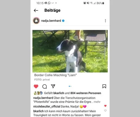 Die ORF-Moderatorin Nadja Bernhard hat sich bei der Tierschutzorganisation PFOTENHILFE gemeldet und die Belohnung für den entscheidenden Hinweis auf den Hundefolterer und -mörder von Altlengbach um 1.000,- erhöht. Und auf ihrem Instagram-Profil ruft Bernhard zu weiteren Spenden auf.